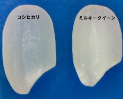 左のコシヒカリに比べてやや白濁した右のお米がミルキークイーンです。